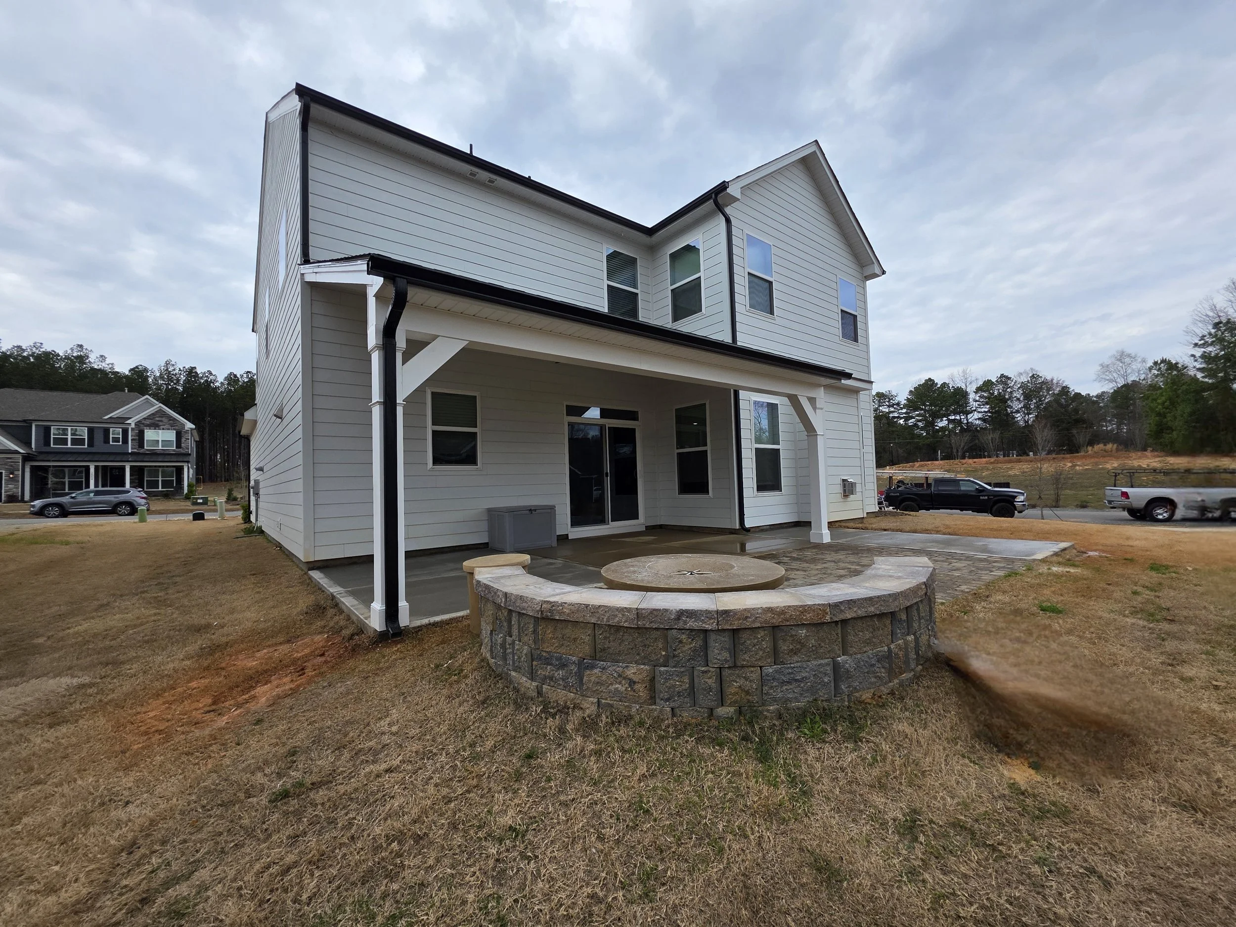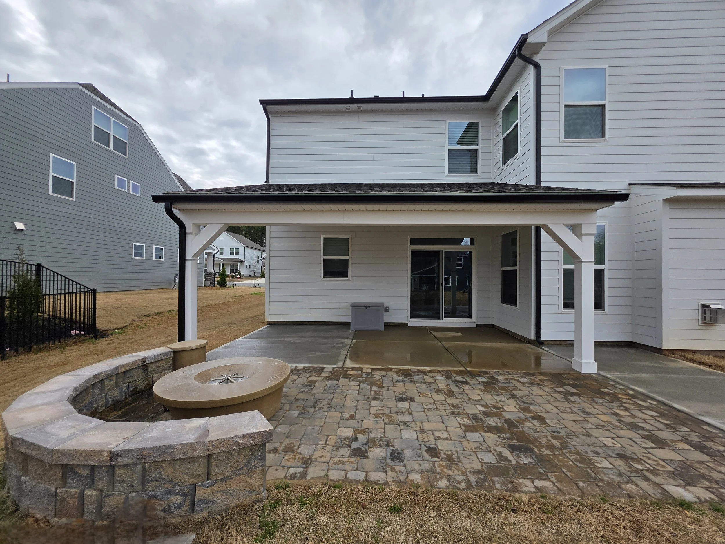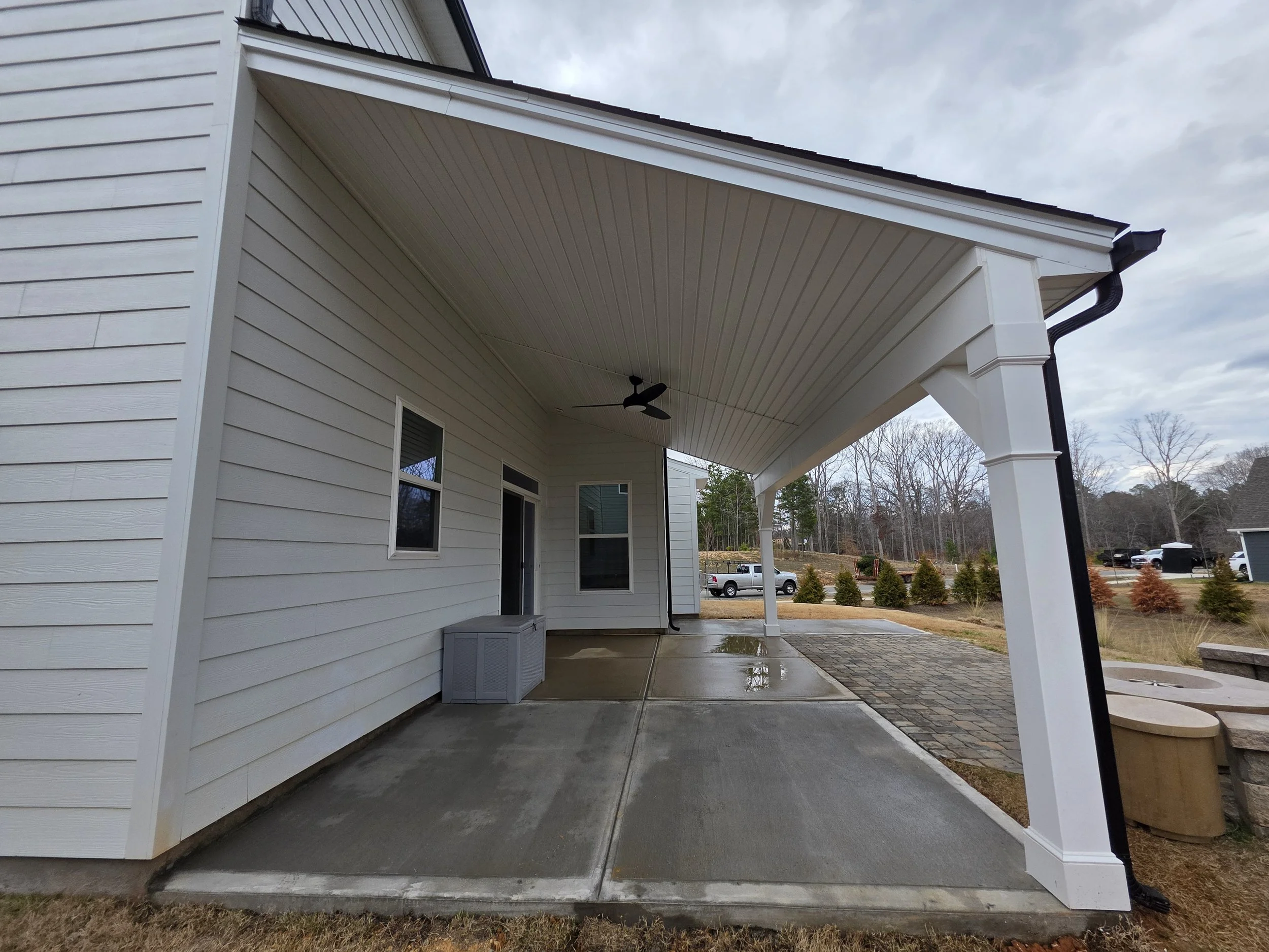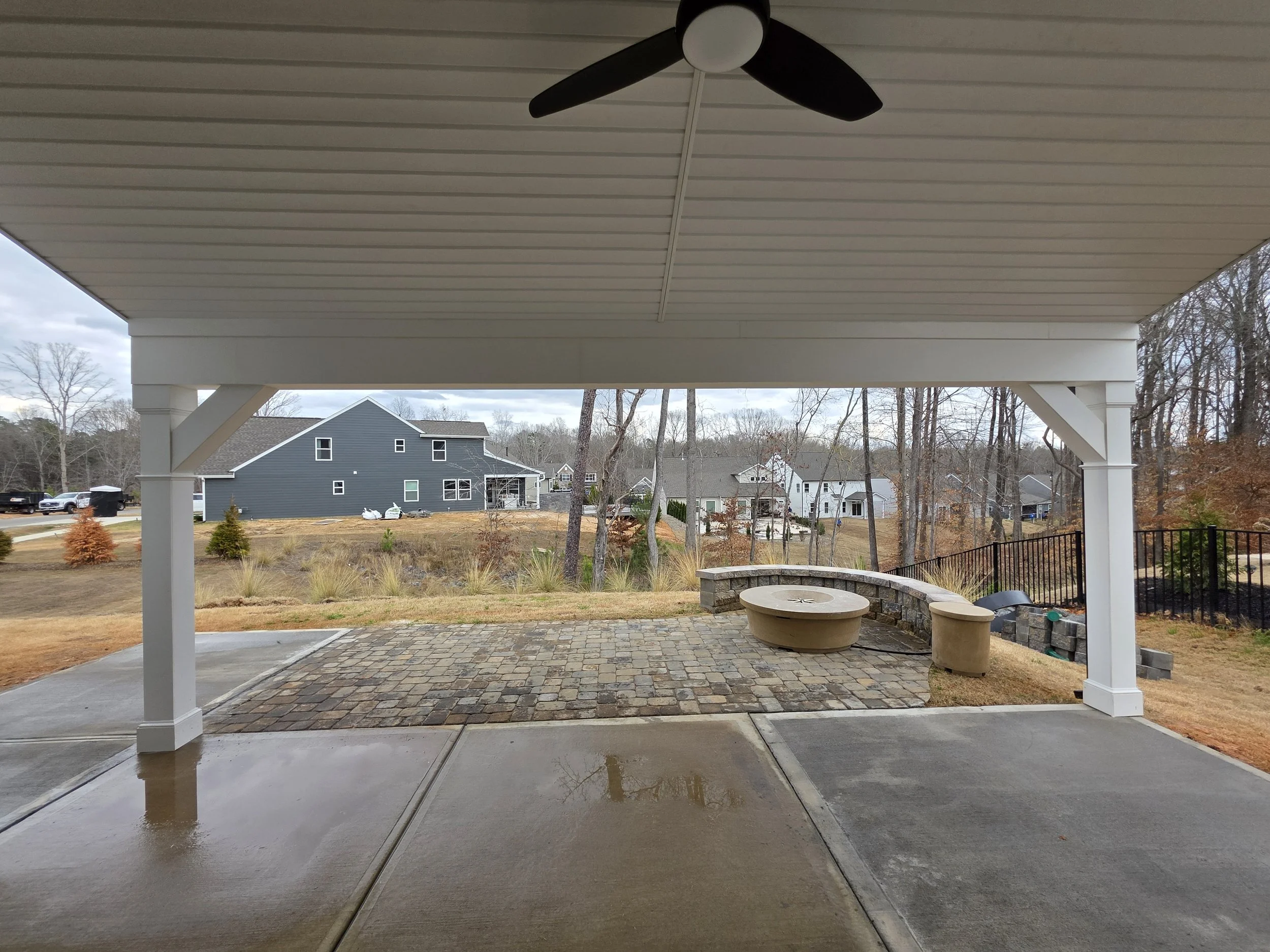 Check out this beautiful 12×22 patio cover with over 475 square feet of patio space between the concrete and pavers, This space features PVC post and header wraps and a vinyl ceiling for a complete maintenance free option, The ceiling fan offers cool air in the summer, as well as the fire pit to keep you warm in the fall.